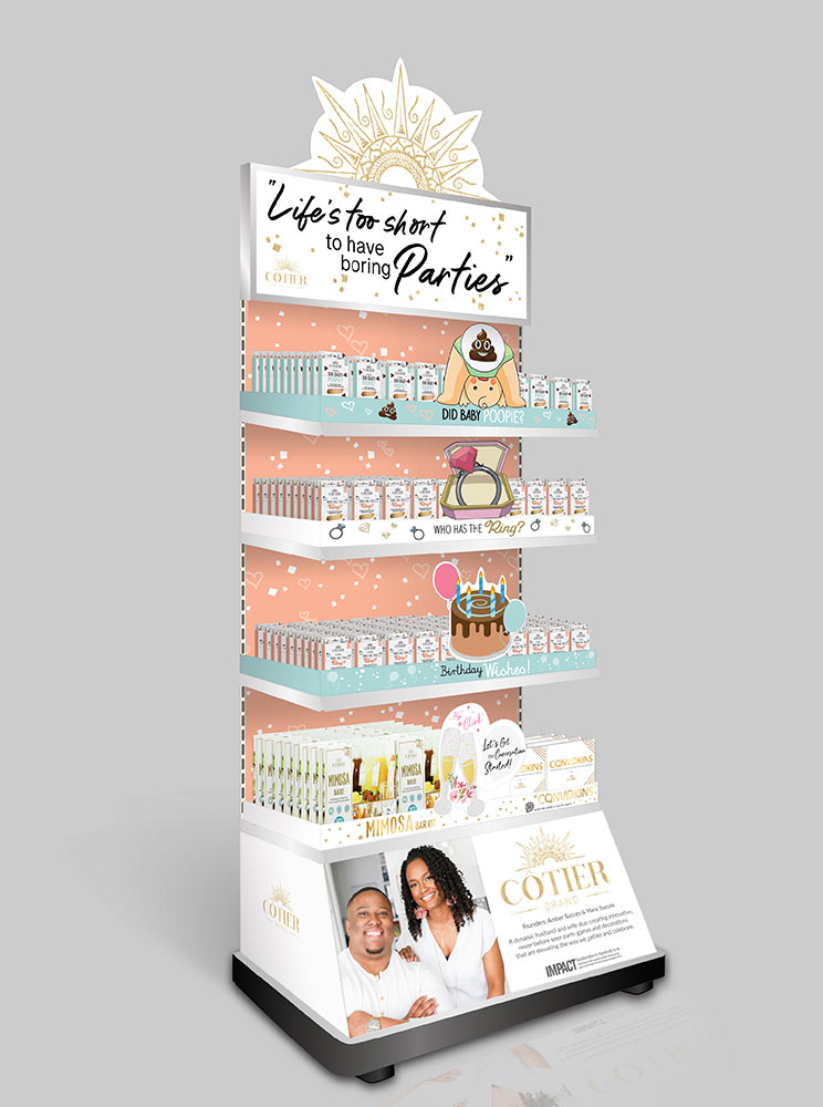- Color and contrast: Use brand colors but also make sure the display stands out from the surrounding shelf space.